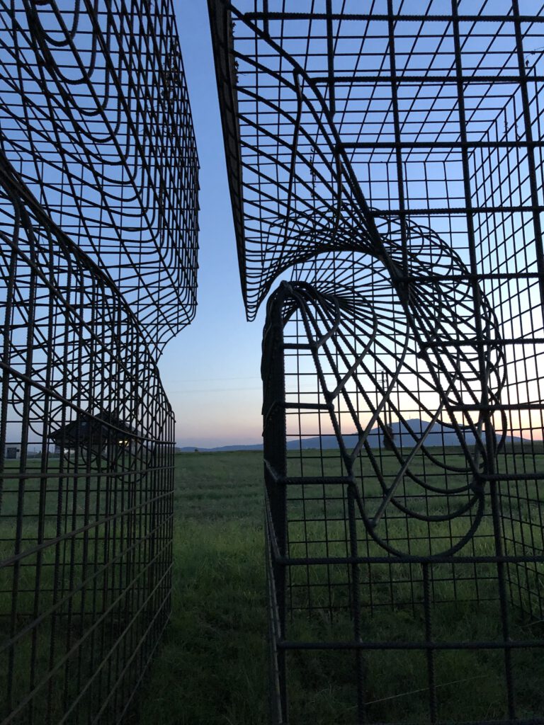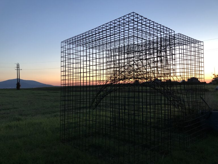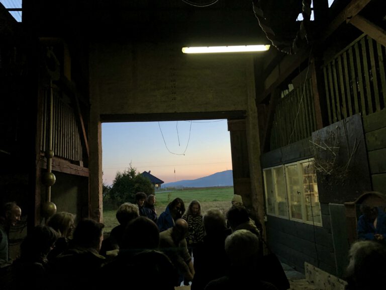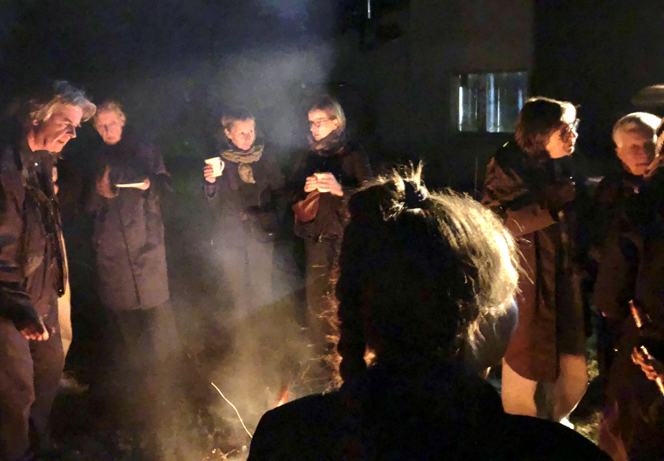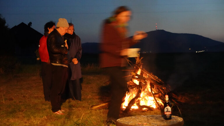 Im Anschluss an die Eröffnung stand ein Bus bereit, um uns in das eine Stunde entfernte, auf dem Land liegende, Studio von Tomasz Opania zu bringen. Wir fuhren in einen wunderschönen Sonnenuntergang hinein und grillten am Lagerfeuer vor dem orangefarbenen Abendhimmel. Tomasz stellte uns viele seiner Installationen vor, das war ein großer Spaß, regte aber auch sehr zum Denken an. Zu Essen und zu Trinken gab es reichlich und in dieser ersten sehr kalten Nacht des Jahres konnten wir uns am Kamin im Wohnzimmer seines Hauses aufwärmen. Sehr zufrieden erreichten wir spätabends wieder Wroclaw.